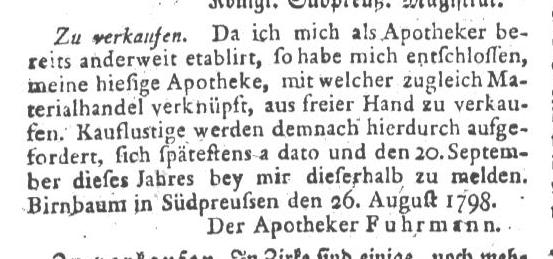 Verkaufsanzeige für die Apotheke in Birnbaum in der „Südpreussischen Zeitung“ Nr. 70 vom 26.Aug.1798