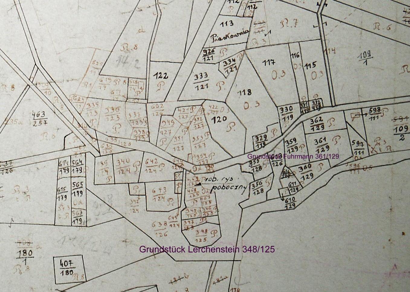 Rechts unten die größere Fläche ist der Radegosch-See mit dem Uferstreifen. Die Grundstücke 361/129 und 362/129 und 595/111 gehörten um 1810 der Familie Fuhrmann, dazu noch weitere Grundstücke im Aussenbereich.